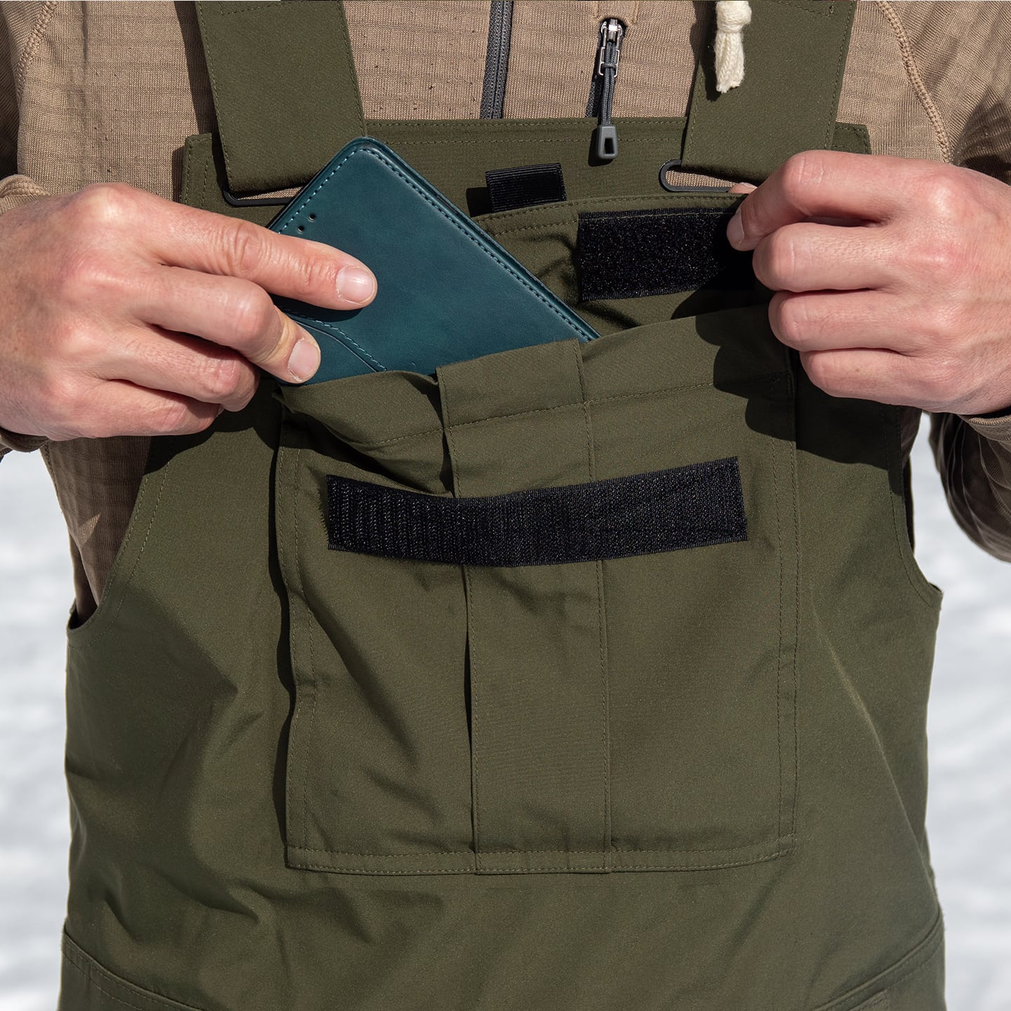 大きな胸ポケットはベルクロで開閉