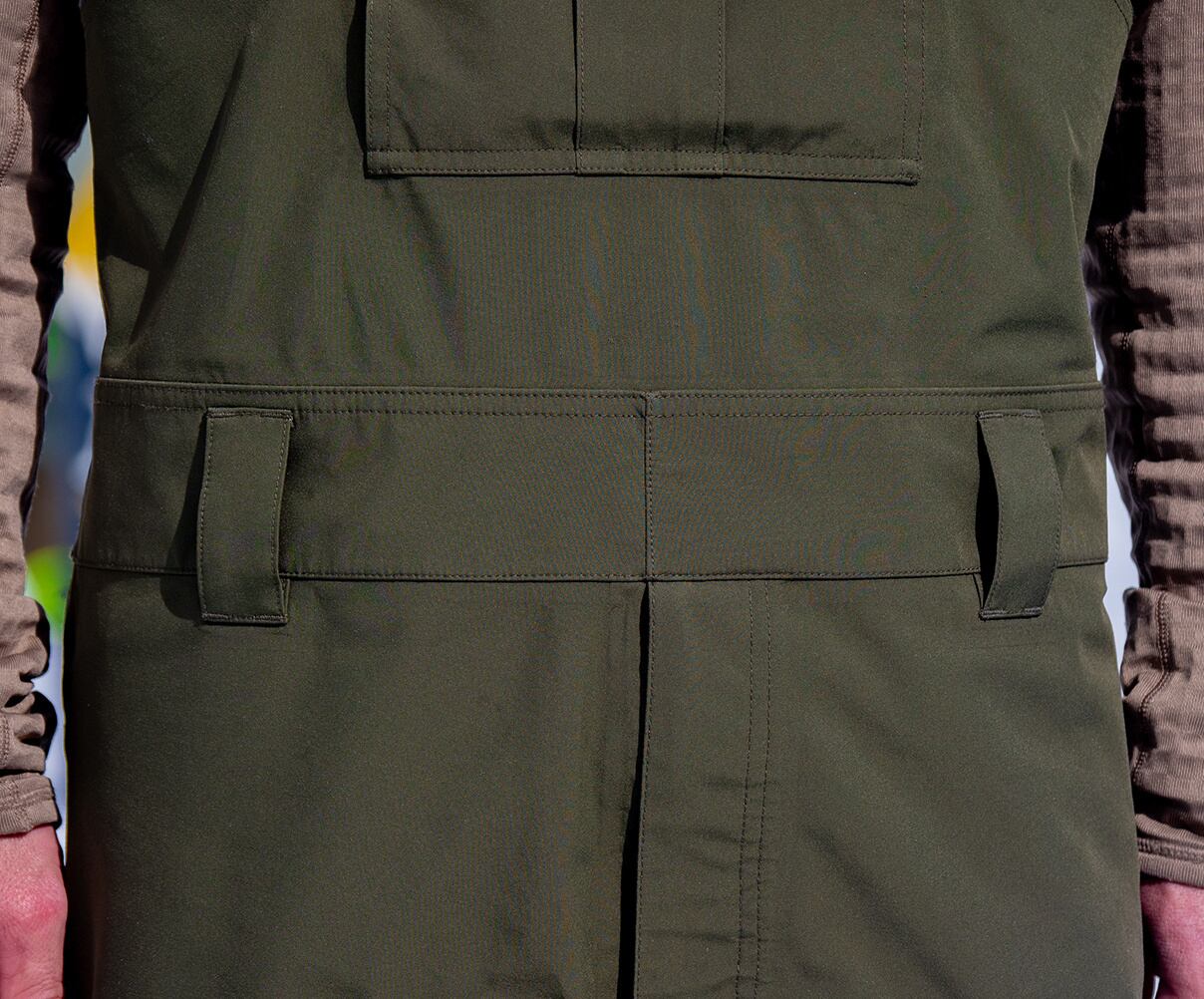 裾にはドローコードを備えており、しぼることでブーツを脱いだりフリーフットスタイルのときでも、裾を引きずらずクールな見た目をキープできます。細部にまでこだわり抜いた設計で、機能性とデザイン性を兼ね備えたビブパンツです。